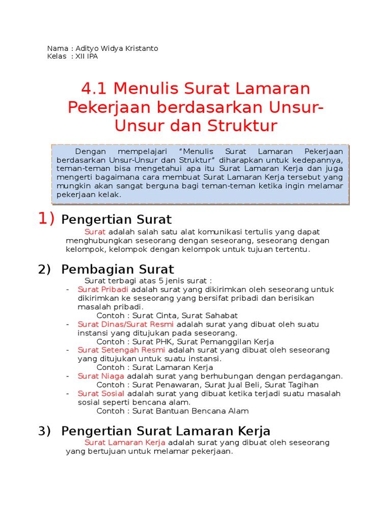 Unsur Unsur Penting Dalam Surat Lamaran Pekerjaan ... from imgv2-2-f.scribdassets.com Saya harap, bapak/ibu dapat mempertimbangkannya dan memberi kesempatan agar saya. Surat lamaran pekerjaan adalah surat yang ditujukan kepada seseorang atau pejabat yang bisa memberikan pekerjaan atau jabatan dari orang yang membutuhkan pekerjaan. Mengidentifikasi unsur kebahasaan surat lamaran pekerjaan pada dasarnya, surat lamaran pekerjaan dibedakan dari berbagai sumber yang diper. Surat lamaran pekerjaan merupakan surat yang ditulis seseorang yang ditujukan kepada lembaga/instansi dengan tujuan mendapatkan pekerjaan. Oleh muhamad abrordiposting pada 3 april 2021. Contoh penulisan alamat surat yang baik dan benar. Kembangkan seluruh bagian yang telah ditulis sebelumnya, kembangkan kalimat pokok menjadi alinea atau paragraf penuh. Menentukan bentuk surat yang distandarkan.